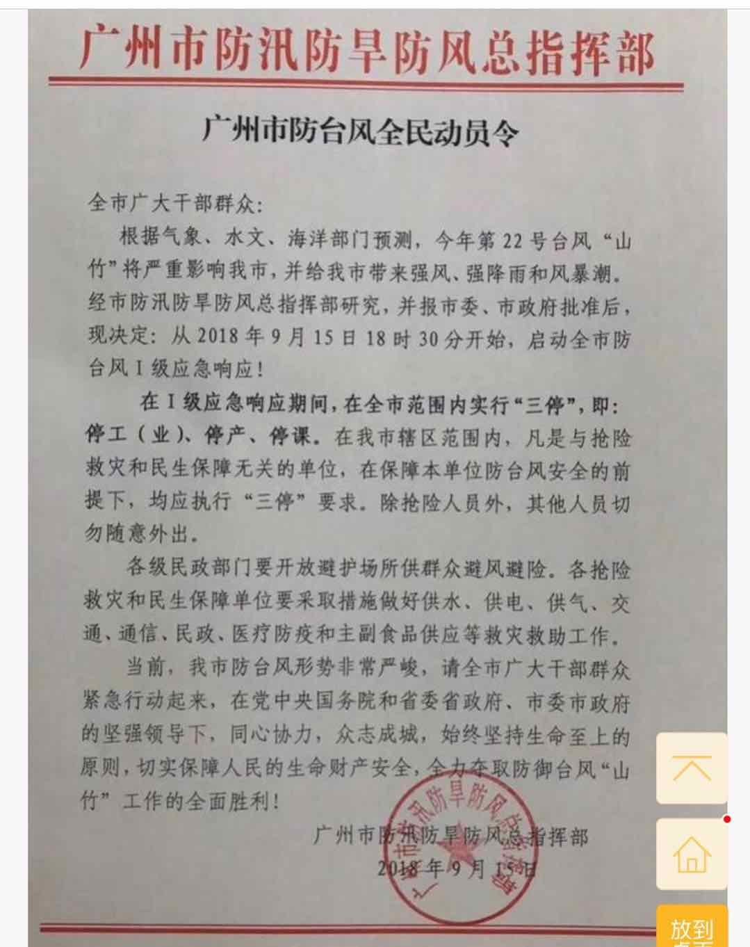 9.15日,本年度超强台风“山竹”逼近广东,预计在16日下午登陆,中心风力预计达17级。 广州市政府决定2018年9月15日18时30分开始,启动全市防台风I级应急响应,在I级应急响应期间,在全市范围内实行“三停”,即:停工(业)、停产、停课。同时,广东全省各市先后发出不同程 度的台风预警信号,要求市民做好防御工作,保证人身财产安全。