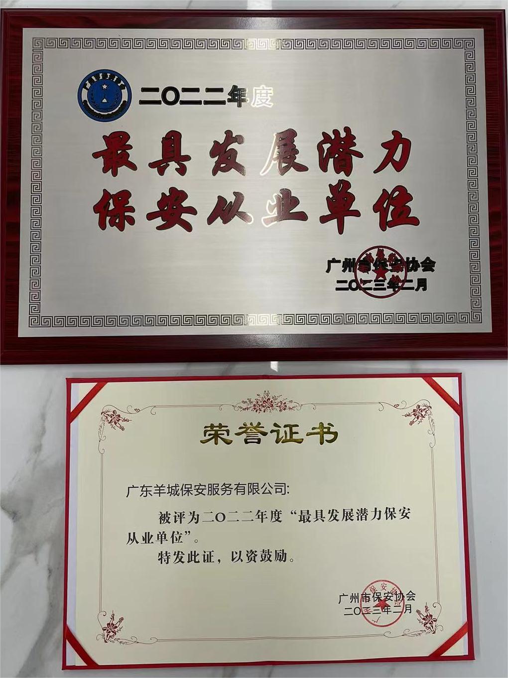 2023年,广州市保安协会表彰2022年度保安行业先进集体,华体会在线平台(中国)官网公司荣获“2022年度最具发展潜力保安从业单位”荣誉称号。